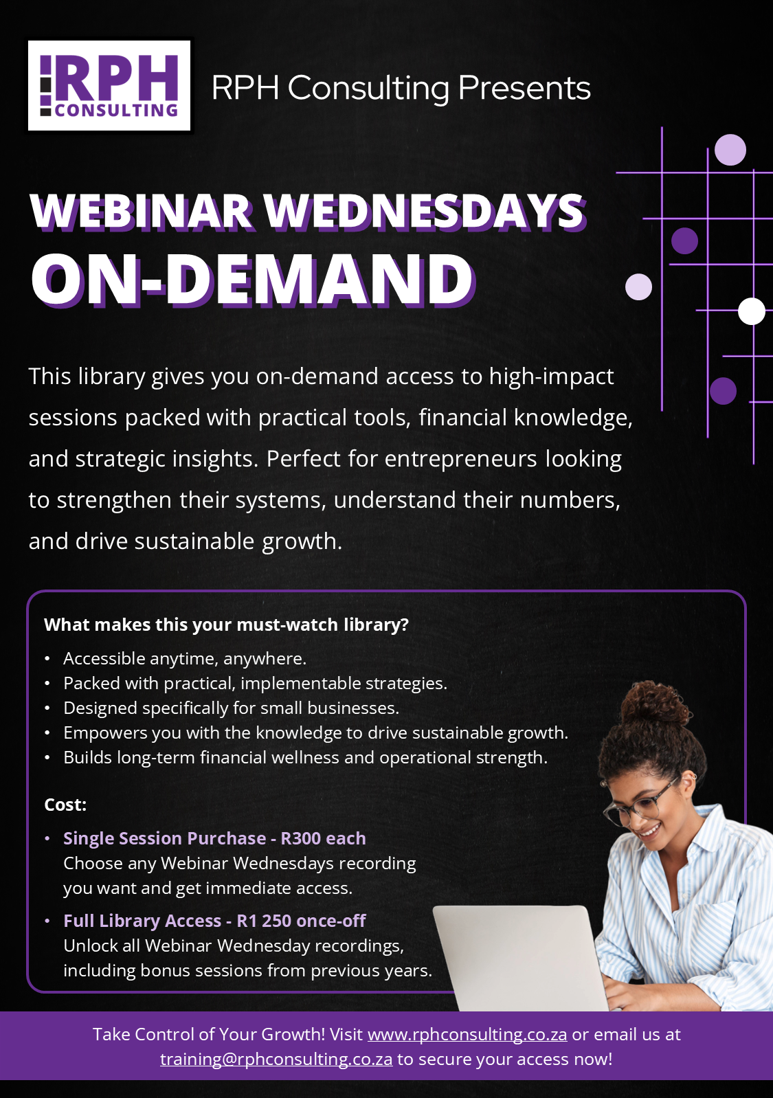 RPH Consulting is excited to offer Webinar Wednesdays On-Demand, a library of powerful business webinars designed to equip entrepreneurs with practical tools, financial knowledge, and strategic insights. These recordings are now available for purchase, giving you the opportunity to learn at your own pace and revisit high-impact sessions delivered throughout the year.